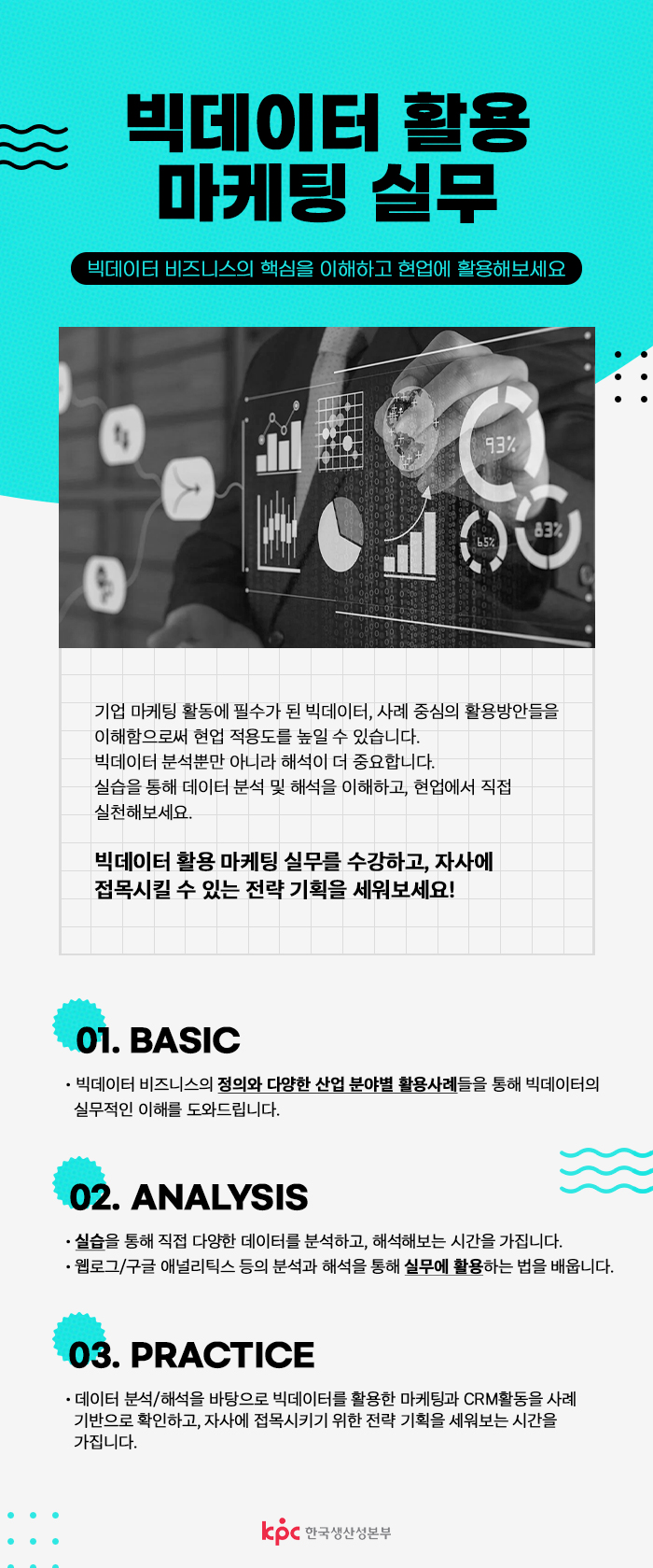 본 과정은 빅데이터 비즈니스의 핵심을 이해하고 현업에서 마케팅전략에 어떻게 활용할 것인가에 대해 인사이트를 제공합니다.