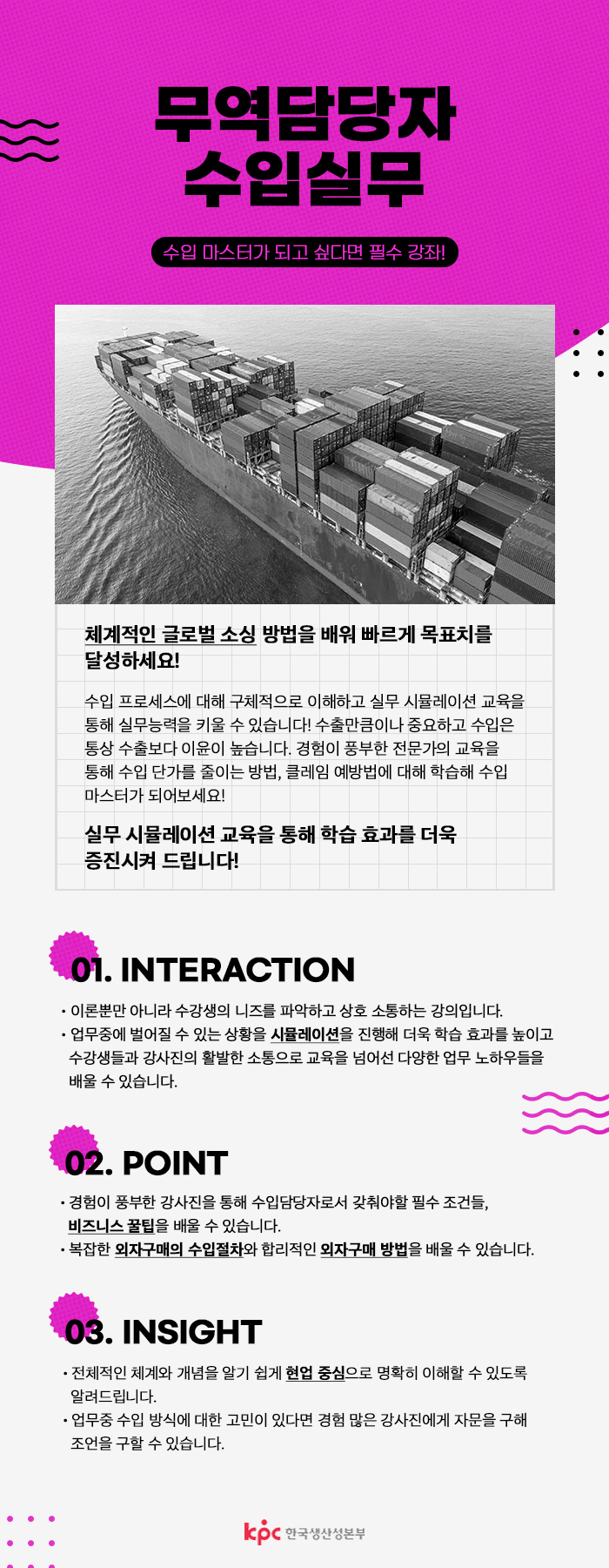 - 관세환급, 통관, 수출입, 해외시장개척, 해외바이어발굴, 원산지관리 등 무역거래 전반에 대한 이해와 개선에 관심을 가지고 있는 실무자 및 관리자