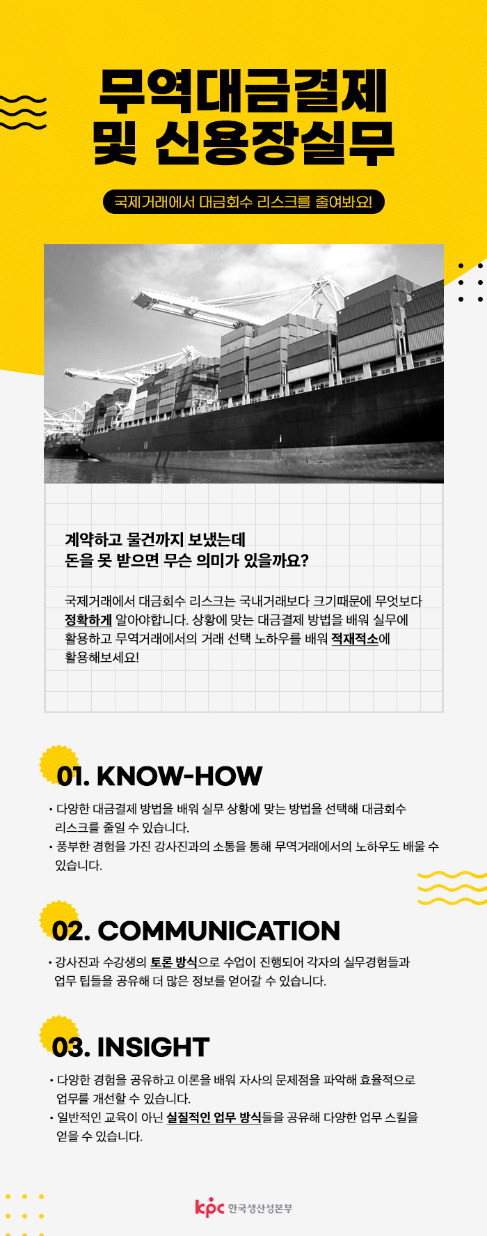 1. 수출입 대금 영수절차 한눈에 파악하는 수출입 대금 영수절차 - 수출대금 영수절차 이해 - 수입대금 지급절차 이해 수출입대금 결제방법 관련 법규 정리 2. NEGO 서류 작성 실무 서류 작성 실전! 다양한 서류 작성법의 이해 - 상업 송장 / 포장 명세서 - 선하증권 / 보험증권 / 환어음 - 검사증명서 / 수출상 발행 증명서 |