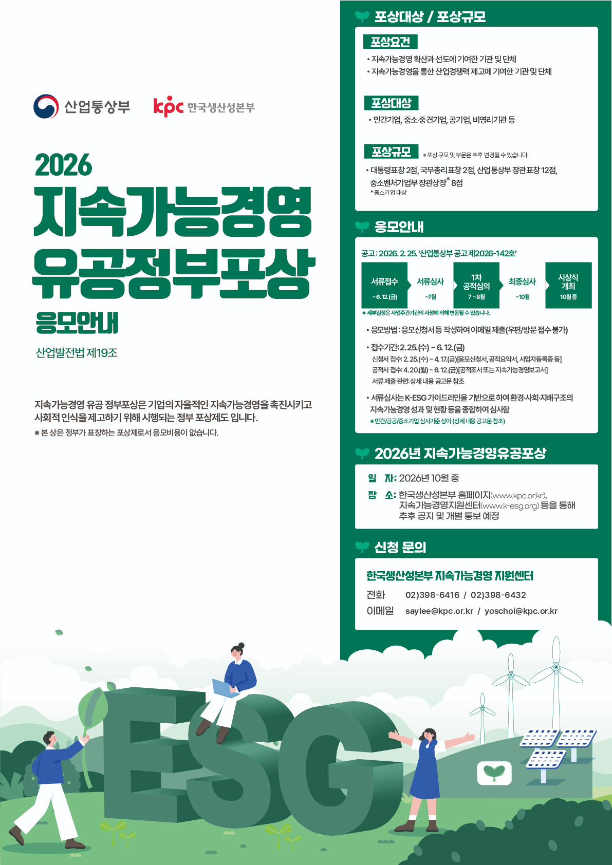 2026년 지속가능경영 유공 정부포상 응모 및 자세한 내용은 한국생산성본부 홈페이지(https://www.kpc.or.kr/), 지속가능경영지원센터 홈페이지(https://k-esg.org)에서 확인할 수 있으며, 의는 한국생산성본부(02-398-6432 / yoschoi@kpc.or.kr)를 통해 가능하다.